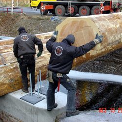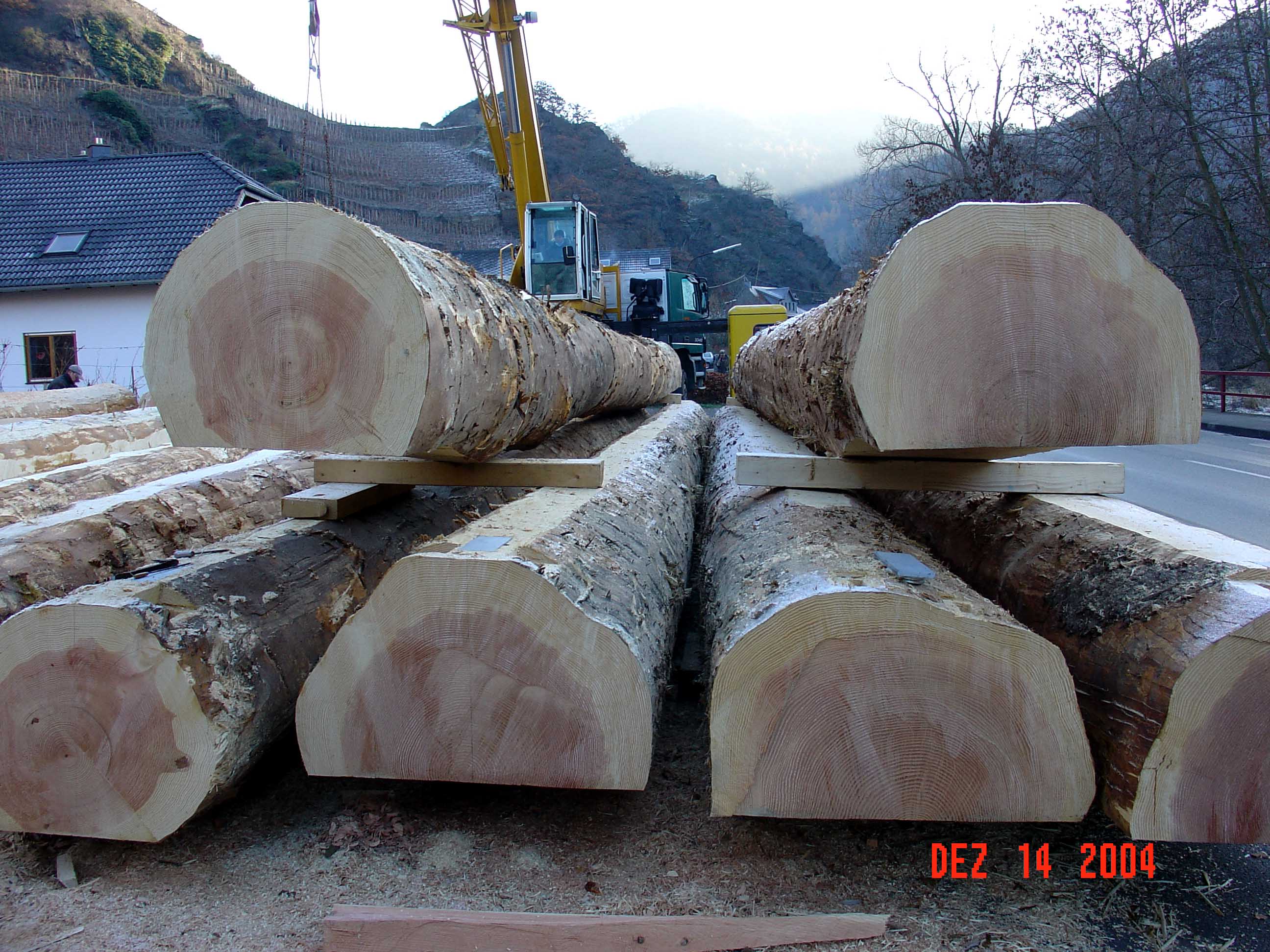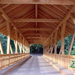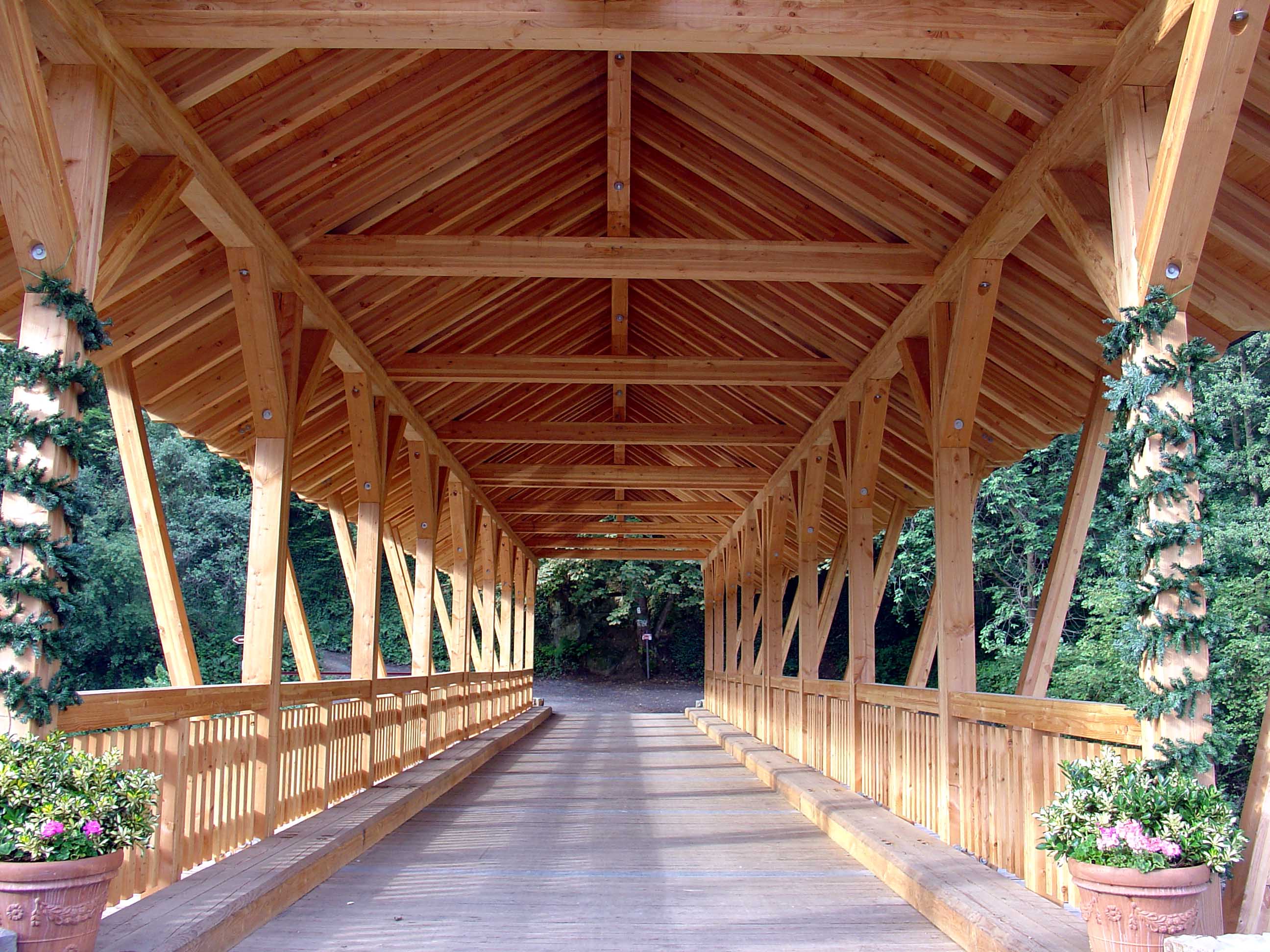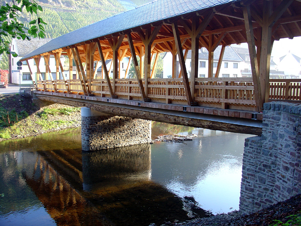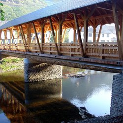 Klassische gedeckte Holzbrücke aus Douglasienholz. Die Tragkonstruktion besteht aus insgesamt 2*5 parallel laufenden mächtigen Douglasien-Rundholzstämmen mit einem Mittendurchmesser von mehr als 80cm.