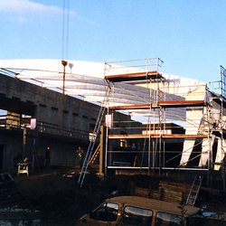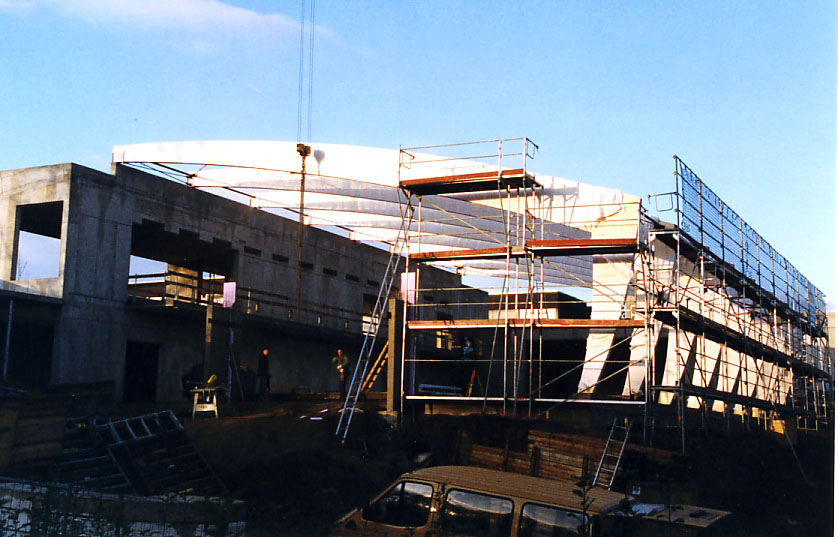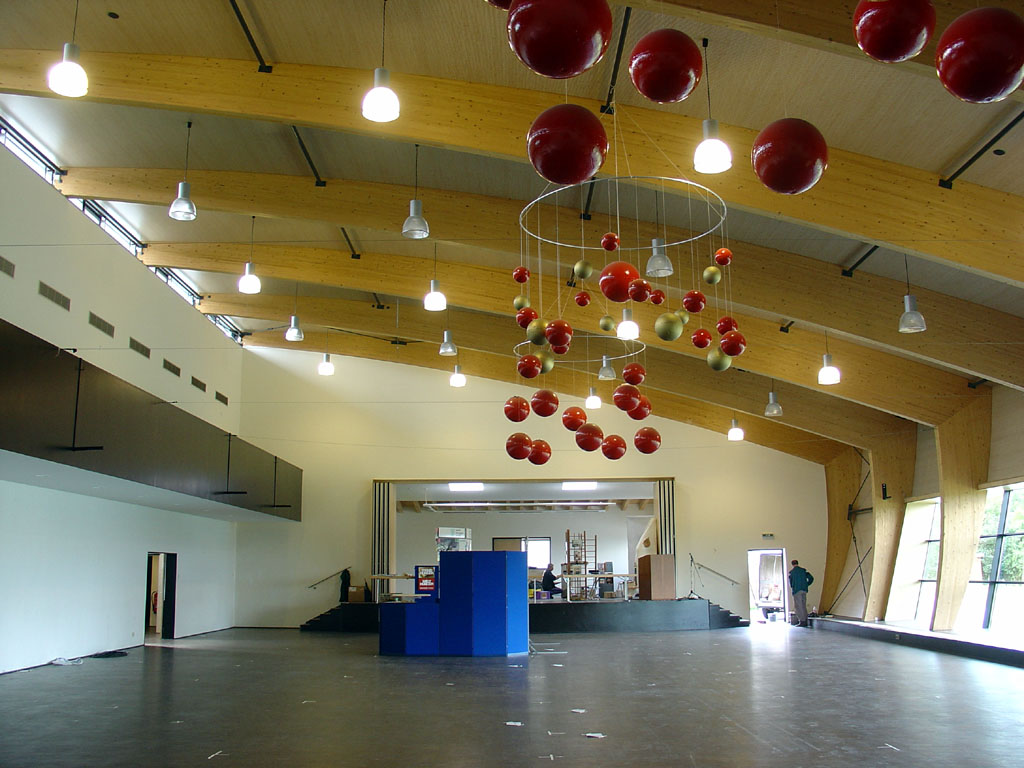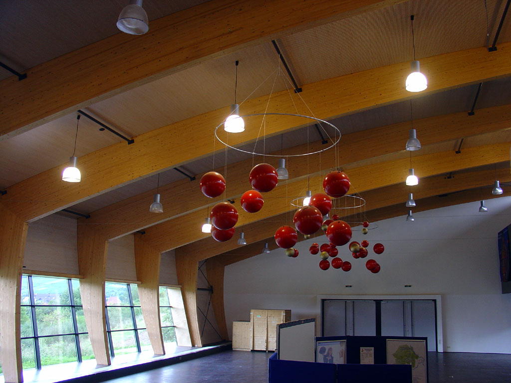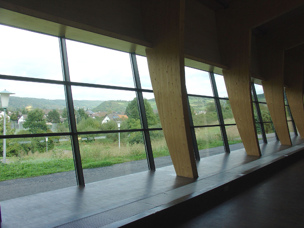 Bei der Landskroner Festhalle handelt es sich um eine Mischkonstruktion, die sich aufgrund der gekrümmten Dach- und Wandform unaufdringlich in das vorhandene und sehr exponierte Gelände einfügt. Dabei wurden die gestalterischen und technischen Vorzüge moderner Brettschichtholzbinder exemplarisch eingesetzt. Die verwendete Holzkonstruktion ermöglichte umfangreiche Eigenleistungen Heimersheimer Bürger, die ein Gebäude dieser Größenordnung überhaupt erst realisierbar machte. Die intelligente Anbindung - auch der Haustechnik - an die benachbarte, bereits vorhandene Schule sowie ein Konzept, das die Nutzung der Bühne als Klassenraum ermöglicht, trugen ebenfalls zur Erhöhung der Wirtschaftlichkeit bei.