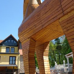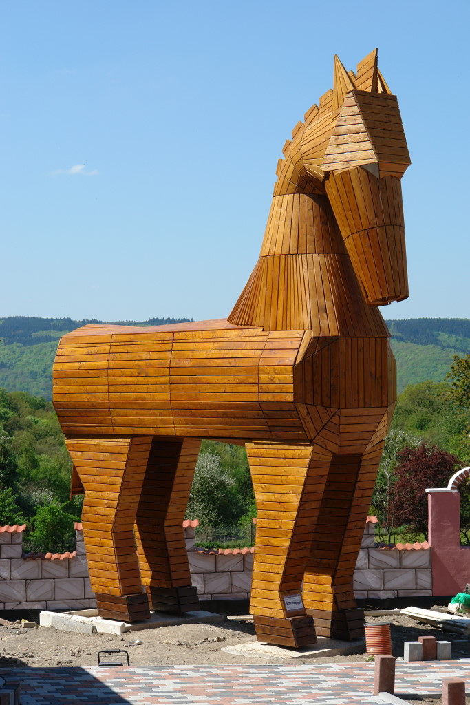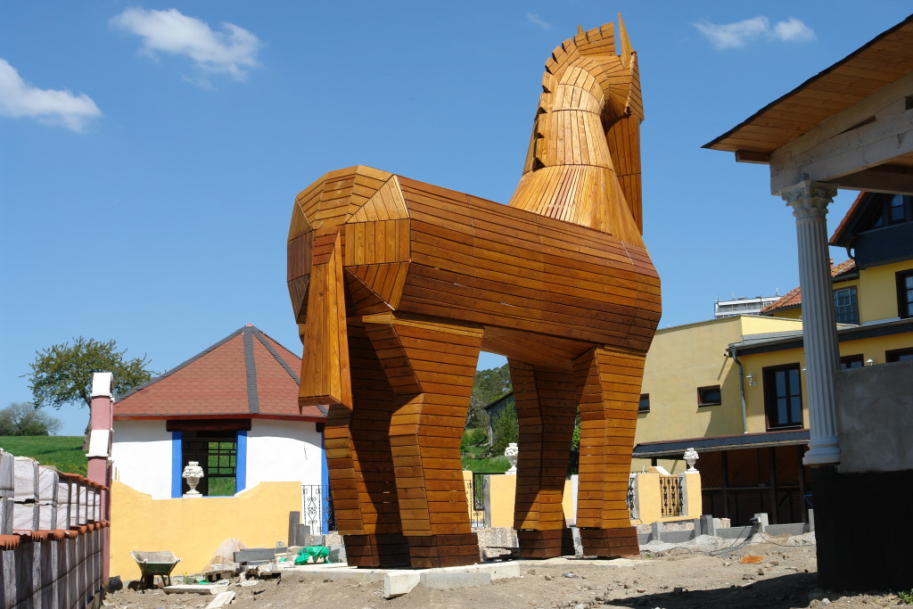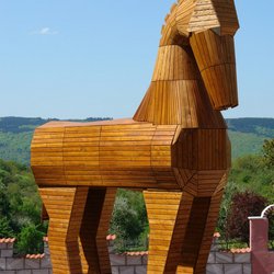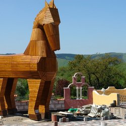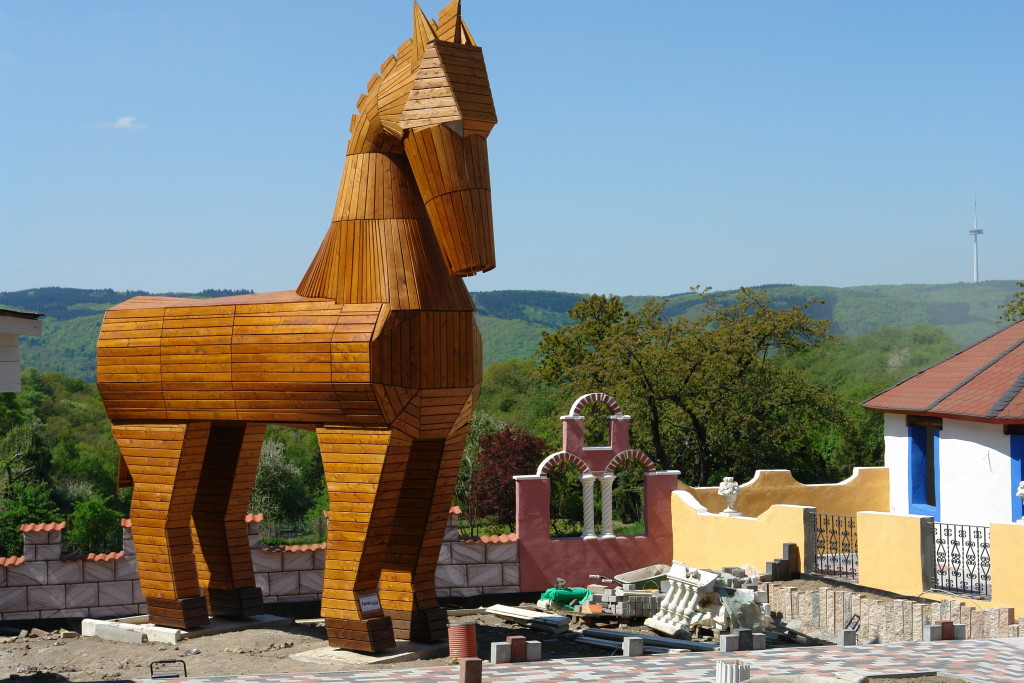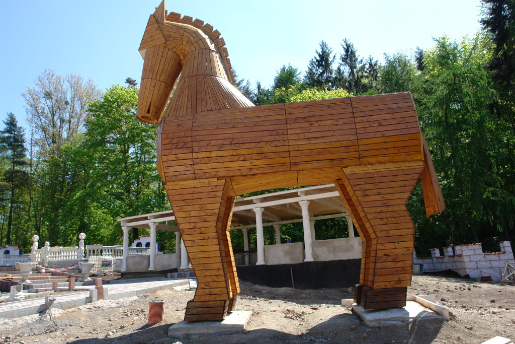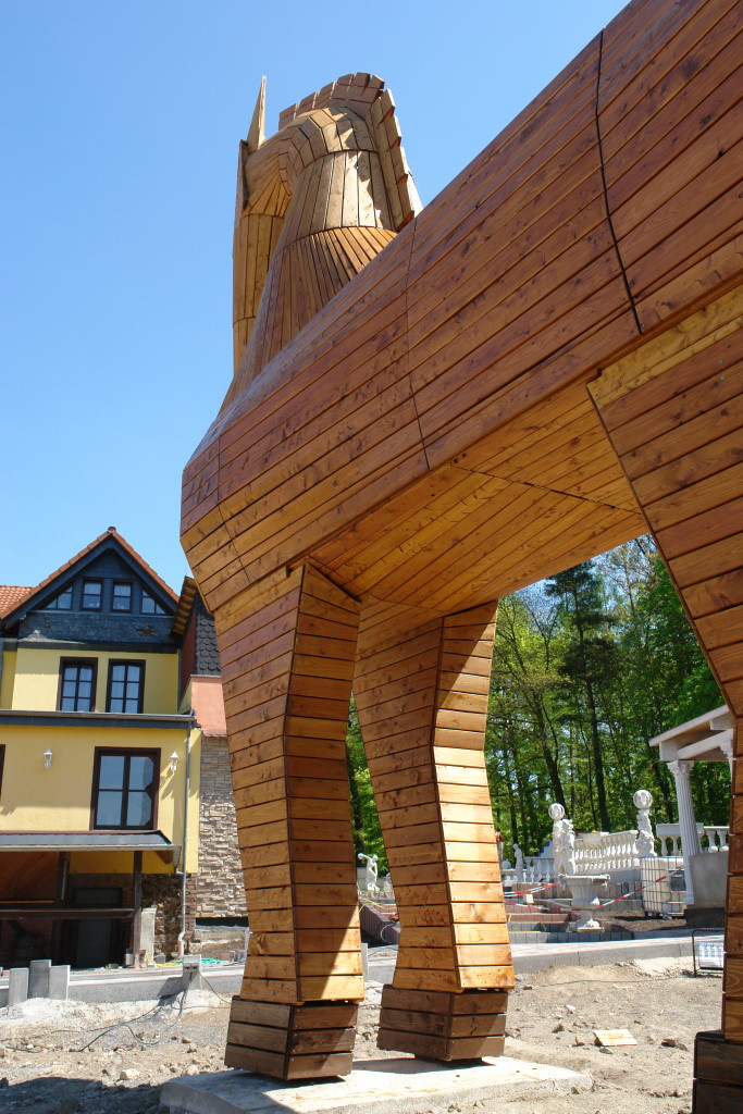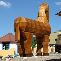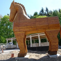 Im Aussenbereich des griechischen Restaurants "Troja" wurde u.a. als überdimensionales Symbol und Werbeträger passend zum Namen ein 7,5m hohes trojanisches Pferd aus heimischer Lärche und Douglasie aufgestellt.
