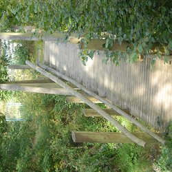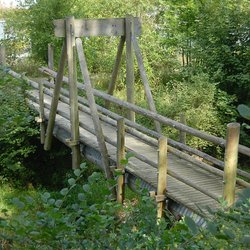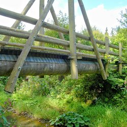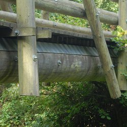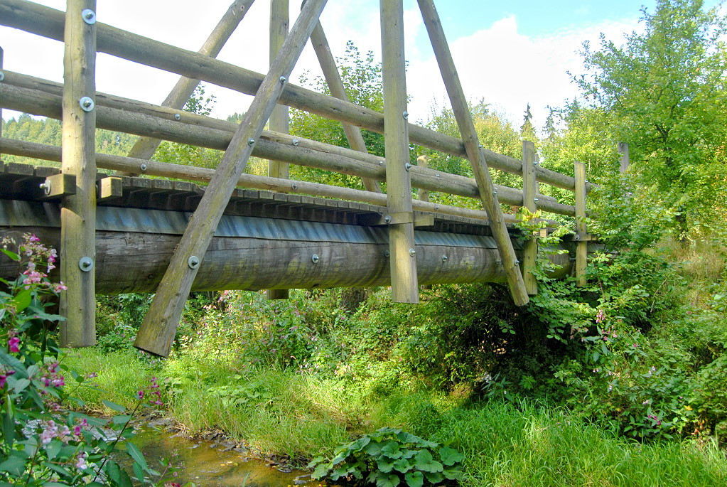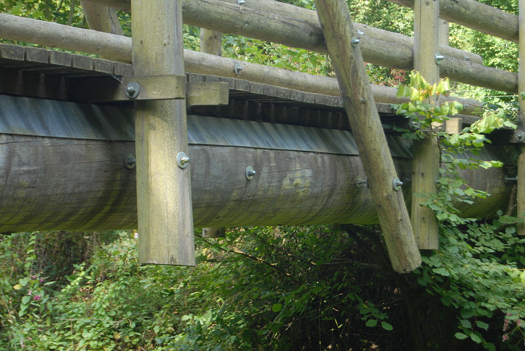 Die Fußgängerbrücke über die Leaser wurde von den Forstwirten des Forstbetriebes der Stadt Daun in Kooperation mit dem Zimmereibetrieb Bons errichtet. Sie spannt etwa 16 Meter über die Lieser. Ihr Tragsystem beruht auf zwei mächtigen Douglasienstämmen, die als Rundholz auf vorhandene Auflager gelegt wurden. Die Konstruktion oberhalb der Gehbahn hat keine statische Funktion.