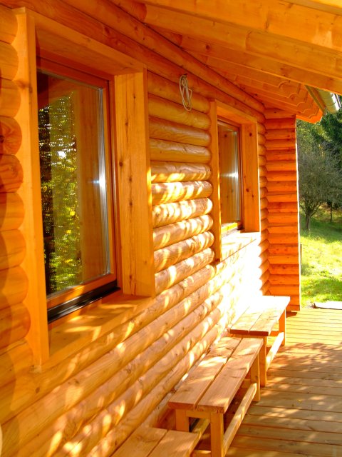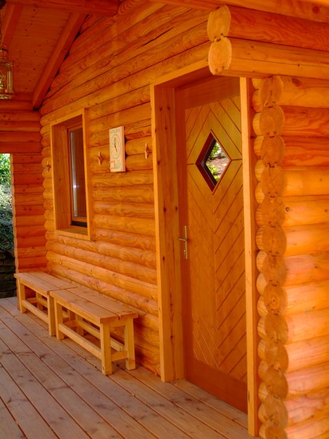 Das Blockhaus aus Eifeler Douglasie beherbergt eine großzügige Sauna. Besonders schön: die Saunagäste können den herrlichen Blick in die Landschaft auch während des Schwitzens genießen: ein großes Panoramafenster macht dies möglich.