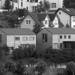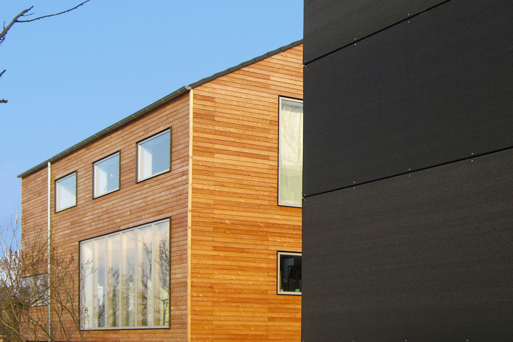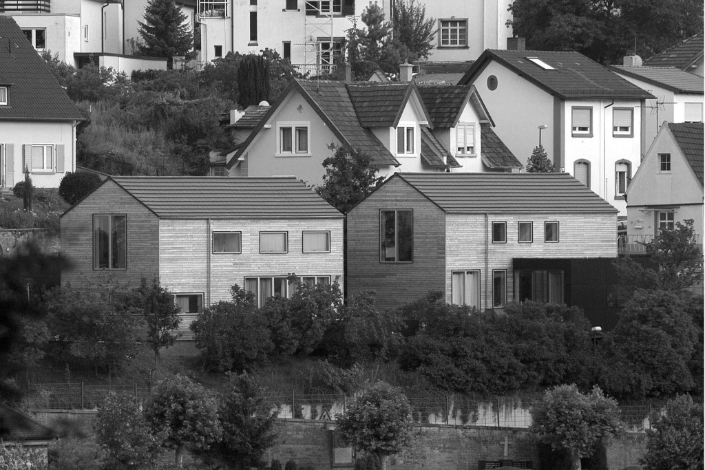 Zwei im Typus identische Einfamilienhäuser, die sich gut in die vorhandene Bebauung integrieren. Mit einem Preis von 900 € je Quadratmeter wurden die Gebäuse sehr kostengünstig realisiert.